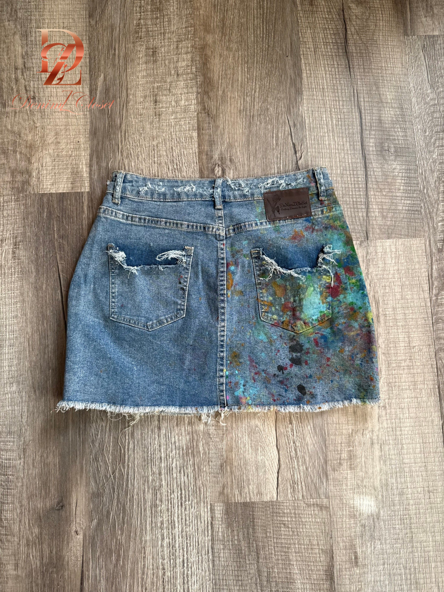 The DenimZ SkirtZzz combines distinctive style with expert craftsmanship, featuring a unique splattered paint design that sets it apart in any wardrobe. Its carefully distressed back pockets add an authentic, edgy appeal, perfectly balancing trend-forward aesthetics with durable denim quality. This one-of-a-kind piece elevates casual looks with an artistic flair, making it a standout choice for those who value exclusive, expertly designed apparel.