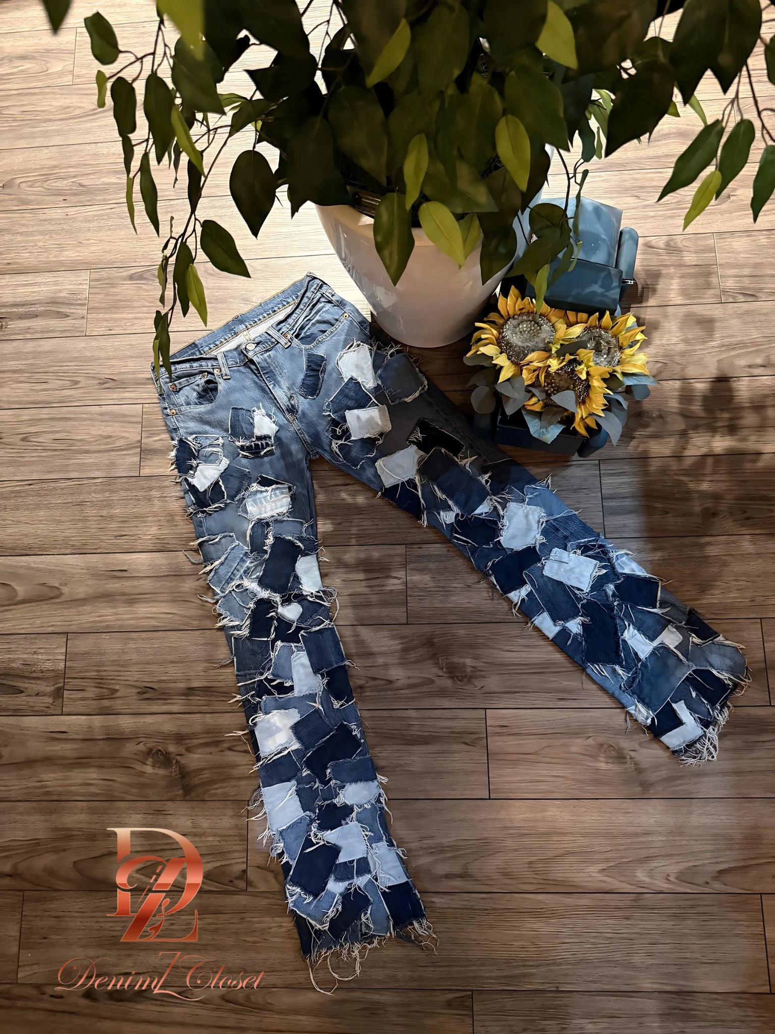 V1 DenimZzz features exclusive patchwork denim constructed from repurposed jeans, with a unique design on both the front and back, making this piece one of a kind.
